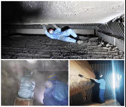 夏季,管网检修,炉膛清理,设备改造等各类事项排满了整个检修期。炉膛的火虽然熄灭了,但是热力人却依然在忙碌着。锅炉的清灰工作看似简单,但事实上锅炉内的作业空间十分狭小,无法起身,漆黑的炉膛里,灰尘弥漫,长热集团汽开事业部的司炉工挥汗如雨,轮番作业,灰尘从他们的衣袖、领口、面罩、帽檐处钻入,黏在身上,粘在头发上,透过面罩钻入鼻腔、呼吸道,时间一久,就会胸闷心悸,甚至连气都喘不上来。钻烟囱、进炉膛、清灰、疏通管道,这一系列动作辛苦异常,就像这样干上一会儿就会让人觉得难受的工作,已成为热力人每年非运行期的必修课,没错这就是默默付出的热力人。